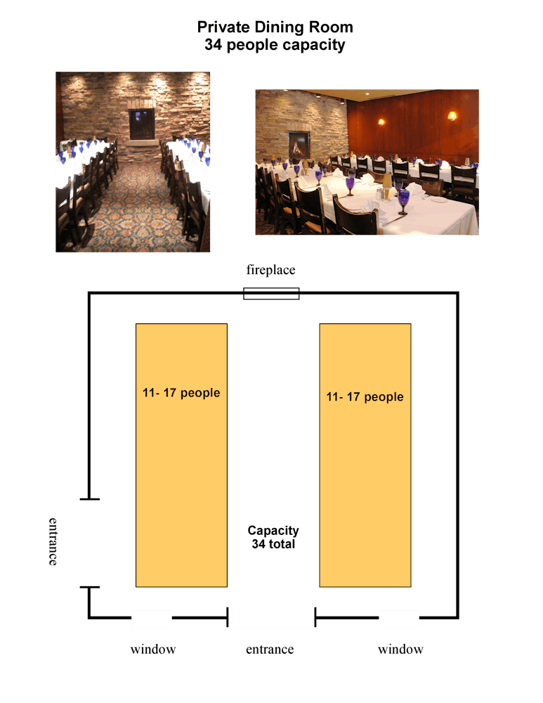 The flagstone wall at the back of the space holds a fireplace. The adjacent walls are of dark wood paneling. Combined with softened lighting, this adaptable room can be warm and intimate for personal gatherings or lit to meet your working needs. It’s the perfect setting for any occasion.